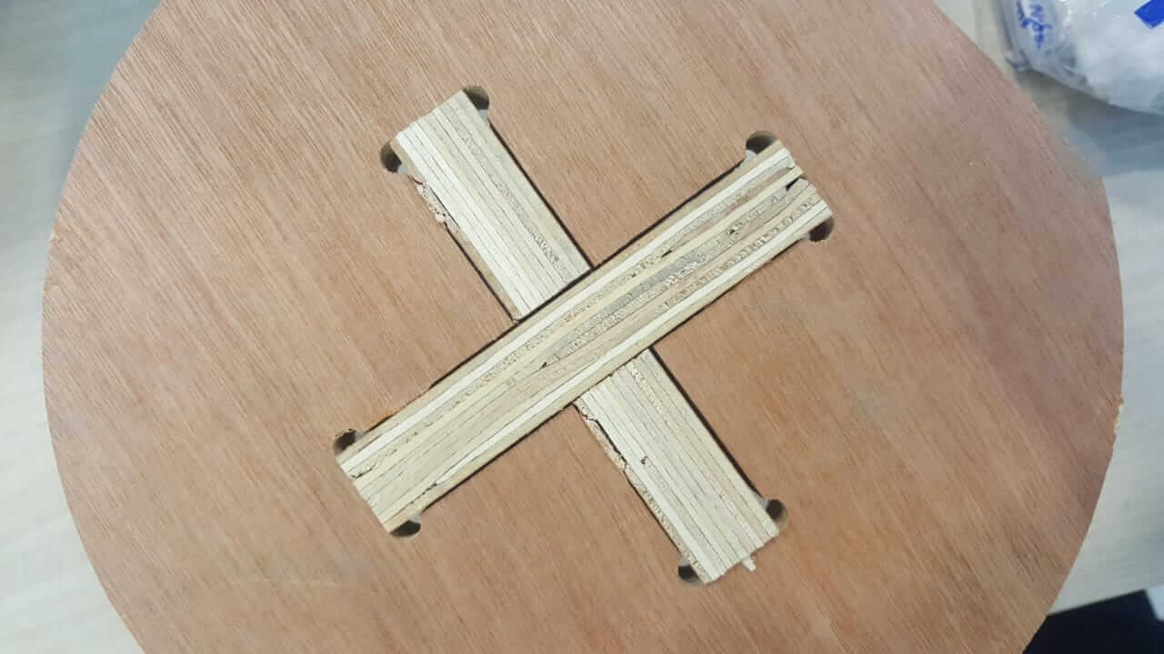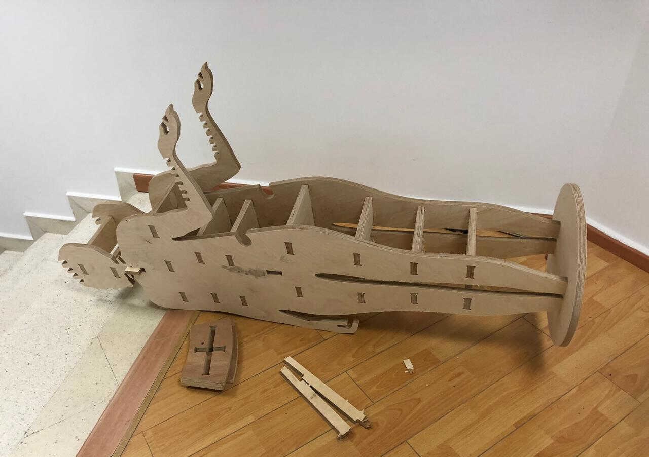 I admit that it was hard to assemble it especially that I have realized that I forgot to add T bones for the tongues; I have just added them for the grooves. That's why I had to put a lot of effort in hammering the pieces in order to fit together and have a 90 degrees angle. I have then decided to assemble it horizontally and removed the vertical lock piece in the middle. And then I added the base and 4 wheels and here it is...