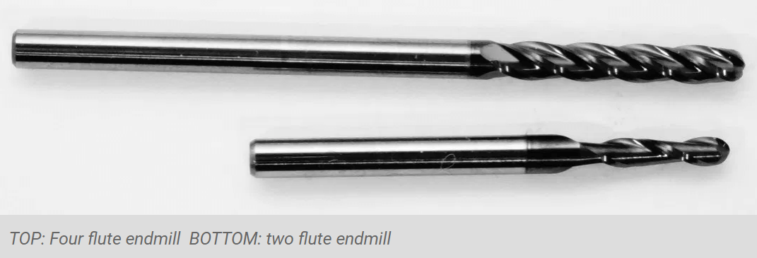 Chipload is the thickness of a machined chip as cut by a specific tool type. More flutes create a smoother surface finish, while fewer flutes remove material faster, but make rougher cuts; they are best at chip clearing, keep heat from building up. Two or four flute cutters are the most common