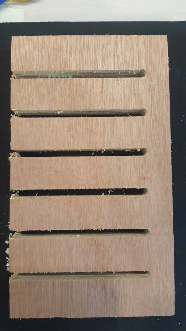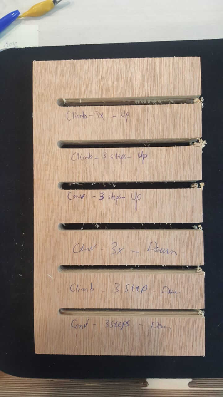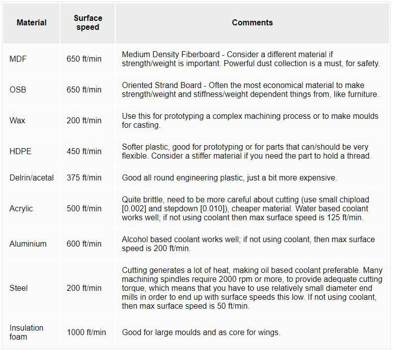 The material we are testing is plywood and which has a similar surface speed to the MDF: 650 ft/min. So the calculation gives us an answer or 10000 RPM. The average of the chipload for the plywood is 0.012 inches and which needs to be divided by two so 0.006 inches (plung rate 50%). That gives us a feed rate of 120inches/min. Note that the milling bit we are using is 1/4'' or 6mm with 2 flutes