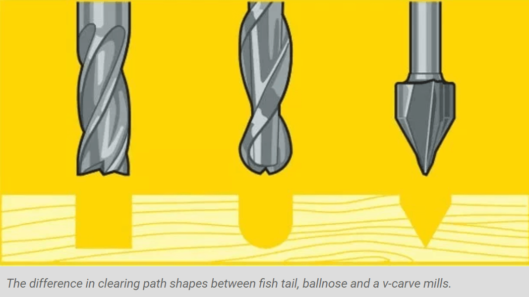 The diagram above shows the difference in clearing path shape between a fish tail, ball nose and V tools. Ball nose mills are often selected when doing 3D contouring because their rounded edge reduces jagged steps when cutting several stepped layers