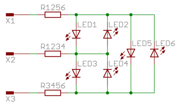 The equation to work out how many LEDs can be controlled is (n)(n-1) where n is the number of pins. For the two LED example above this would be 2 * 1 and the six LED example would be 3 * 2. There is obviously a finite amount of LEDs that can be driven and there are almost certainly some other issues that I am not aware of that will limit the amount of LEDs that can be driven.