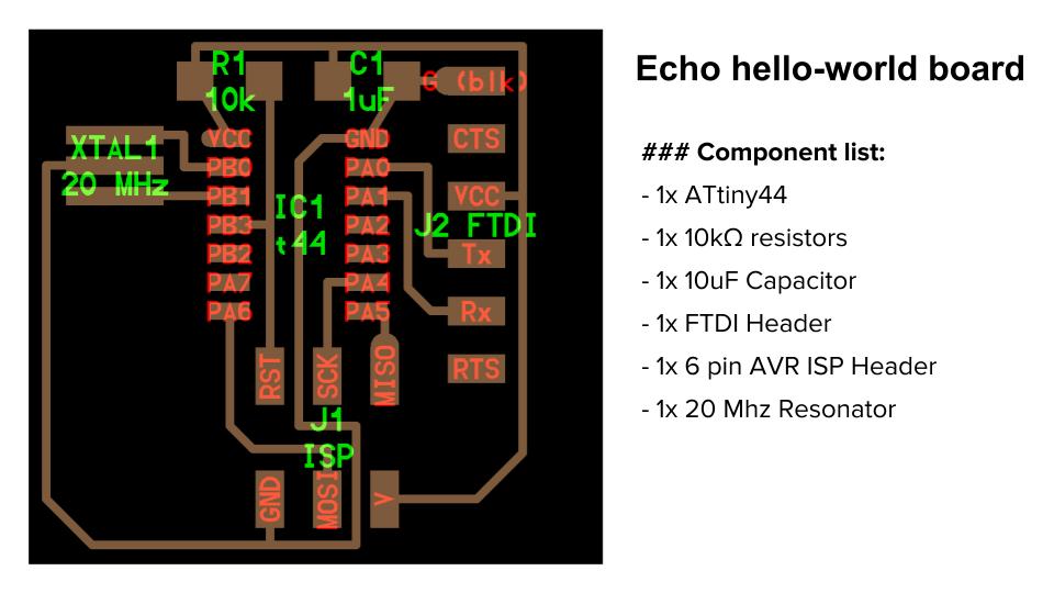 ATtiny44 (echo hello board) - Microcontroller - Microcontroller is a small computer on a single integrated circuit. it wil take command in the sense of programmes and execute them physically with the help of various components attached to it