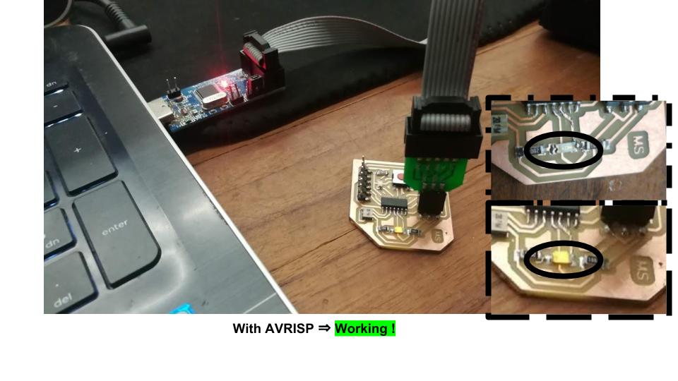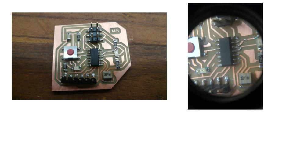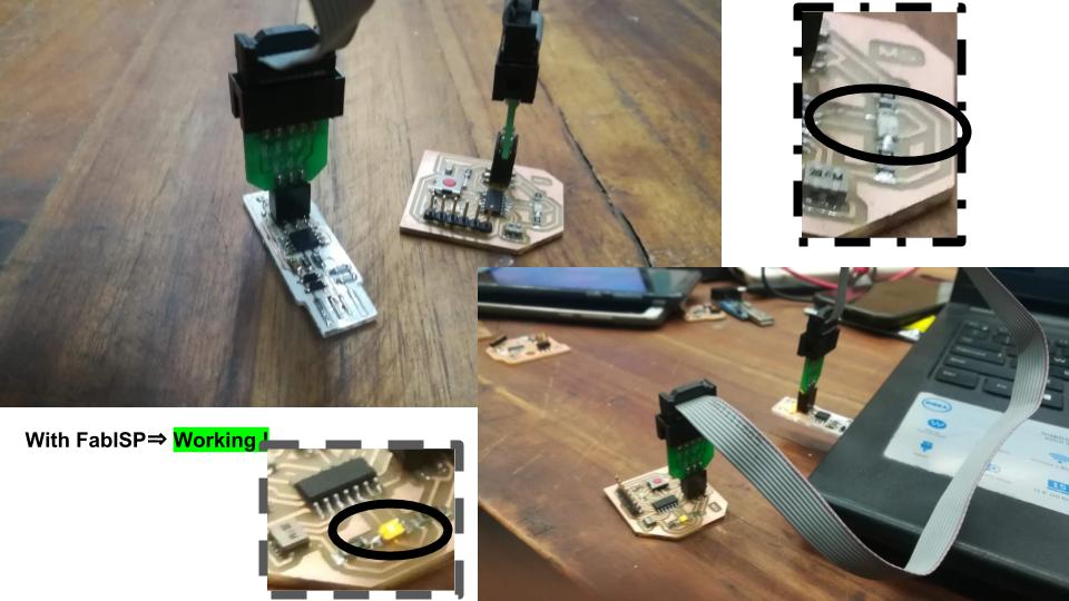The rest of the fabrication was exactly the same as for the FabISP In-Circuit Programmer (load pictures into the fab module, send to Modela, 1/64 mill for traces, 1/32 mill for profile, clean, flux, solder, remove flux).