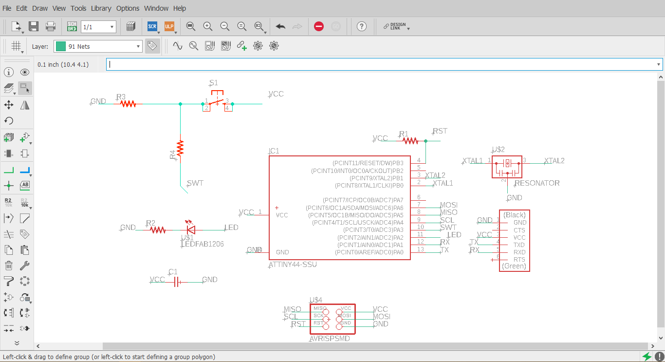 Redraw the echo hello-world board,add (at least) a button and LED (with current-limiting resistor) check the design rules, make it, and test it extra credit: simulate its operation.