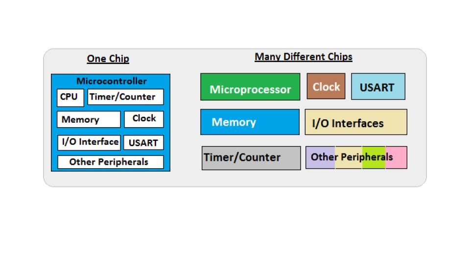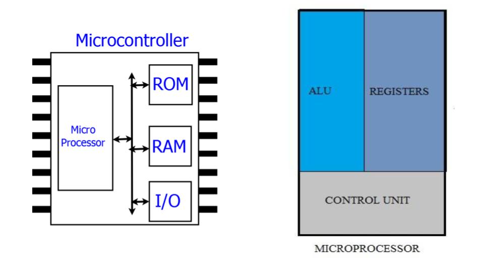 A Microprocessor on the other hand is just a CPU one has to add externally memory, clock, input/output interfaces, timer and all other needed peripheral. This is the reason a microprocessor has so many pins.
