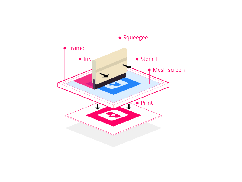 Screen printing is the process of transferring a stencilled design onto a flat surface using a mesh screen, ink and a squeegee. Fabric and paper are the most commonly screen-printed surfaces, but with specialised inks it’s also possible to print onto wood, metal, plastic, and even glass. The basic method involves creating a stencil on a fine mesh screen, and then pushing ink (or paint, in the case of artwork and posters) through to create an imprint of your design on the surface beneath.