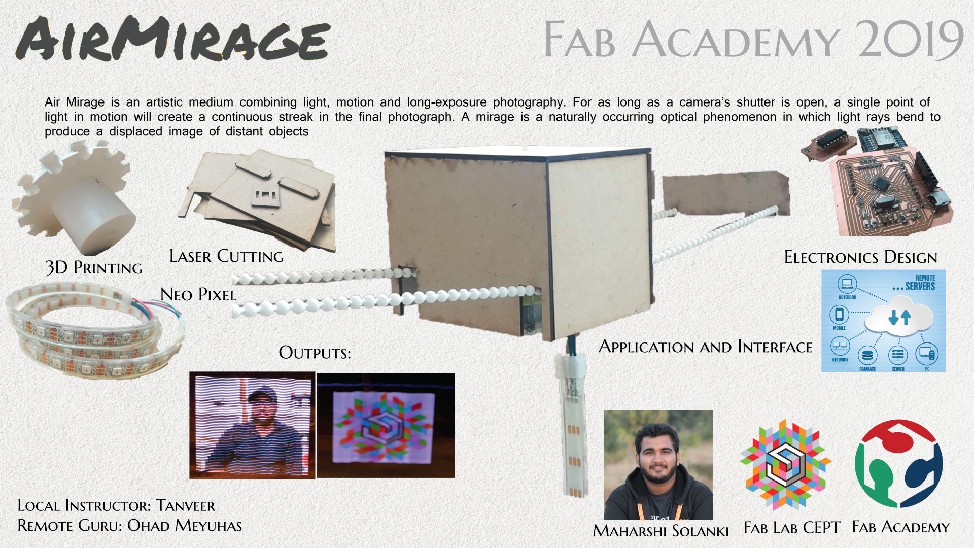 • AirMirage is an artistic medium combining light, motion and long-exposure photography. For as long as a camera’s shutter is open, a single point of light in motion will create a continuous streak in the final photograph.