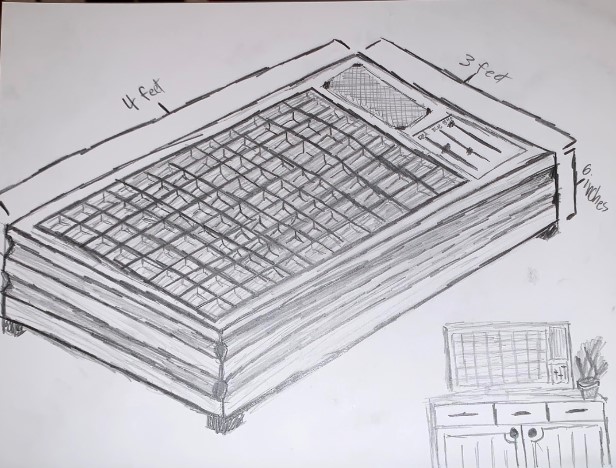 Bellow, you will find the two sketches I made to help me plan. The one above is a larger version to give you a better general idea of how my project will look, it includes estimated dimensions and a sketch of how it may look in my room once it is finished. The one below is more diverse to show off multiple aspects of the project. It includes things such as design considerations and possible variations that I may make to my project in the end.