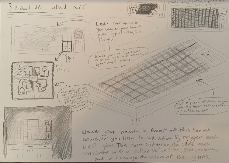 I began my first week of Fabacademy by planning out what I wanted to do for my final project. We were required to create a sketch of what we wanted it to be, and in the sketch, I tried focusing on certain aspects of my idea individually, as well as considering how my project would fit into the environment that it was intended for.