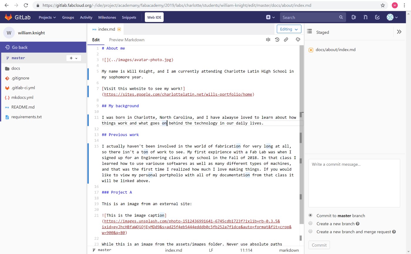 After taking things in and trying to figure out how to navigate gitlab in the first place, I finally made my first changes which are pictured bellow.
