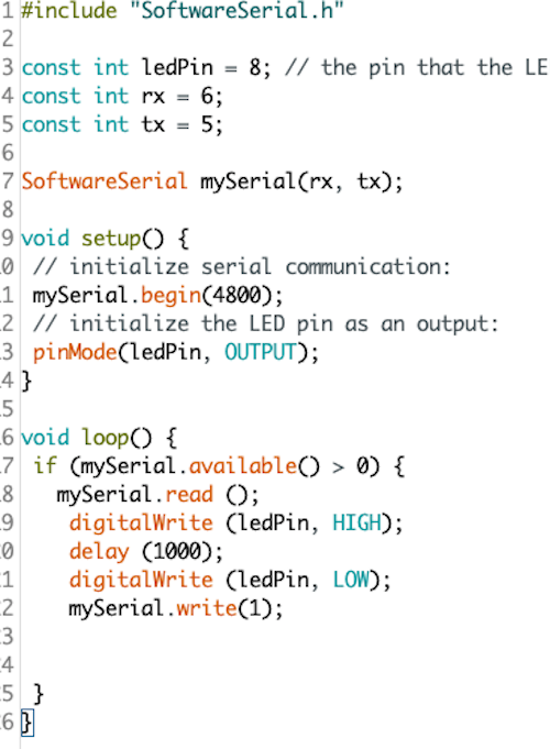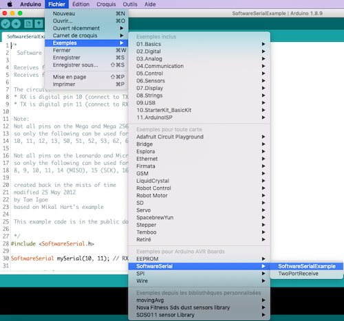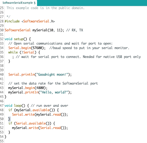 To communicate with the tx,rx, we need to have a master, where the information is comming from and a slave, this one answer to the master. The master will send by his tx pin ( transmiter) a message to the rx pins (receiver) of the slave to give some instruction. Than if we want to, the slave can answer back with his tx pin to the rx pin of the master. This is how it will communicate. The code will have to interact to both board and this is why arduino haved made this Software seriallibrary that can send and receive information. I start by opening that library. The most important of that code is probebly the way they call the rx