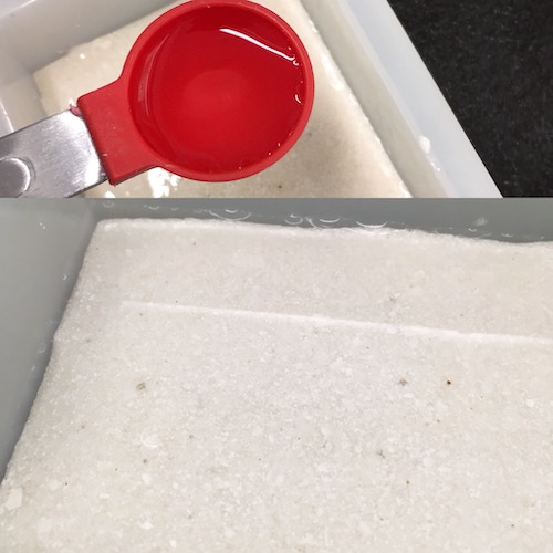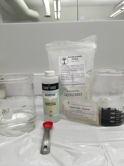 In the lab we already have the agar agar and the water (obviously) and the Glycerol. Be careful here, the glycerol, glycerin or glycerine are all the same. The glycerol refere usually to a pure concentration and the glycerin or glycerine refer normaly to a commercial name so the concentration is around 90 to 99%. I use some vegetal glycerin from coco. The alginate I ordered it like I said before. For the coffee ground I take used expresso ground from my coffee machine.