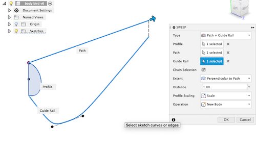Fusion 360 has a very great tool to draw with parameter and constraint. Regular geometric form are great and easy to constrain and change parametrically, but what about a more organic shape.Spline and Conic curve can they be parametric too. I decide to create a bird body that I can easely change the size.