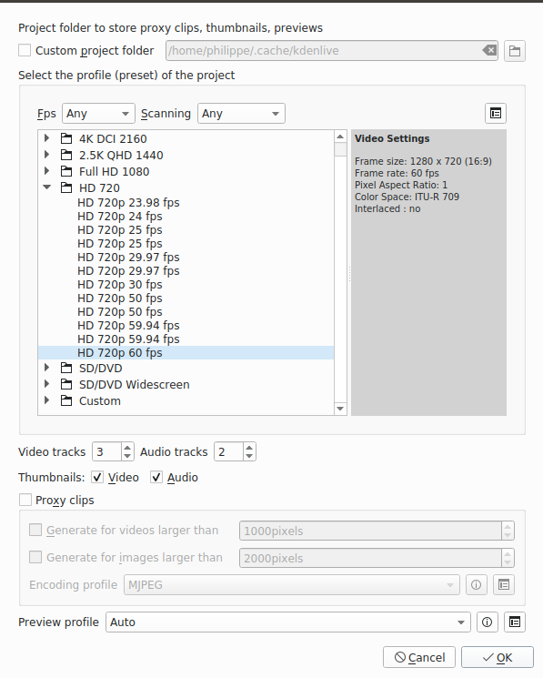 Create a Kdenlive project. Since we want to publish our video on Internet, HD 720p with 60 fps is a good compromise.