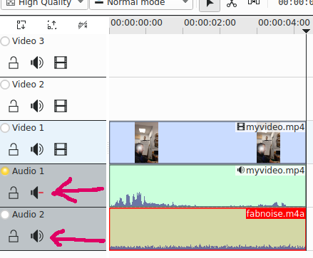 In our video, there is some background noise we don't want to keep. Right-click and select Split/Audio. You could decide to keep it for further use or delte it. If you click on the speaker icon, it will remain on the timeline but it will not play.