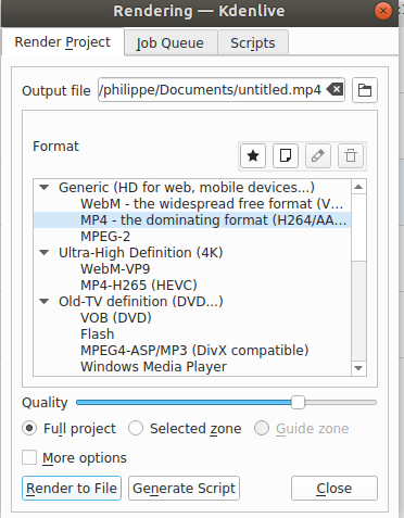 Once everything looks ok, the last step is to render it (i.e to create one single output file). Click on "render", select MP4 (or any other format supported by most web browsers) and click on "render to file"