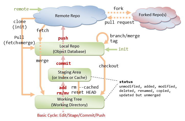 The following schema is a pretty good summary on how information is flowing between your local computer(in green) and the remote repository (in blue). See this site for a more detailed tutorial.