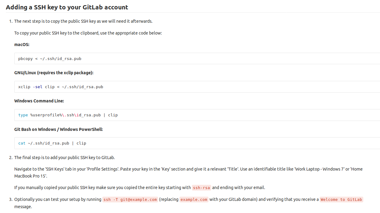 From security point of view, there are two options: the first one is to secure the communication channel using HTTPS, the second one it to rely on SSH and a RSA key. The SSH way has the advantage that you don't have to enter your credentials again and again but it requires some configuration. Basically, you have to generate a RSA key (asymetric encryption key) on your local computer (Note: do NOT sudo the commands since the folder where the RSA key is stored is user specific) and then copy the public portion of the key on the GitLab server. Here it how it looks like:
