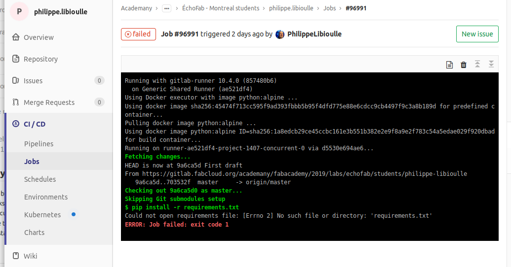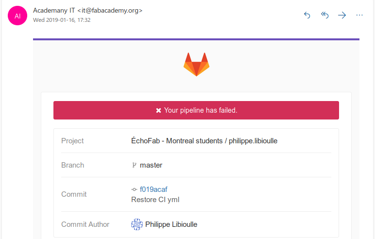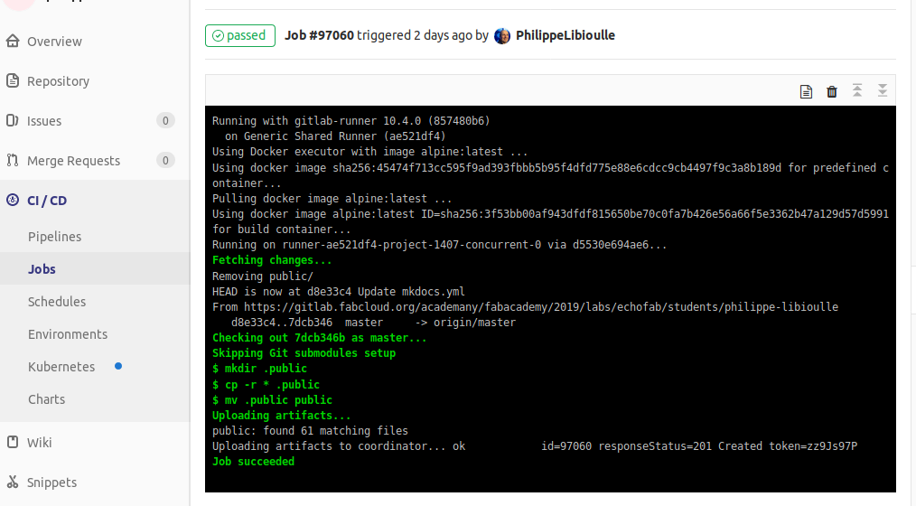Fab Cloud staff tried to help students and they provided a tool and a mechanism to publish static web site content and to move it to the right final location (which is http://fabacademy.org/2019/labs/echofab/students/philippe.libioulle/ in my case), so it could be visible for local and regional instructor and for other students as well. On the my Fab Cloud repository page, here is what is explained: