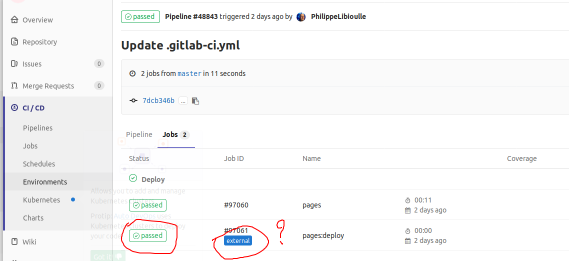 The pipeline runs two jobs: the first one crunches the content and build a set of HTML pages and the second one should nove it to the final location. But it does not...and I don't have a clue why since it is an "external" job I cannot see anything