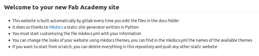 It means the staff has create a pipeline (a set of jobs to perform each time updated content is pushed) and the pipeline is designed to deploy content built using Mkdocs. I restored the initial content and then it ran smoothly... at first sight