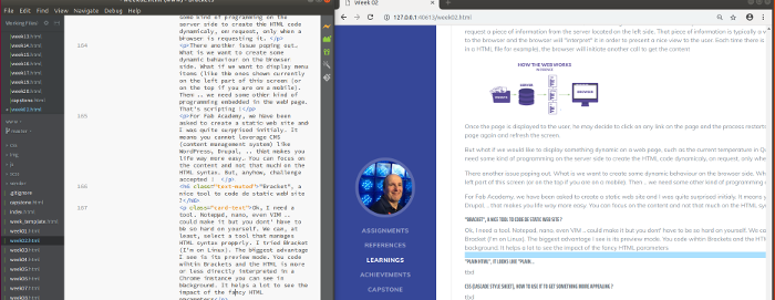 Once downloaded, have a look to the HTML code. I changed the set of colors (in the CSS) and I updated the list of links. By default, this is a "one page" template where everything resides in the same HTML file. Fab Academy journey is long enough to require multiple pages, typicaly one per week. Within your main page, instead of refering to local items (using #zzz tag), just refer to external pages
