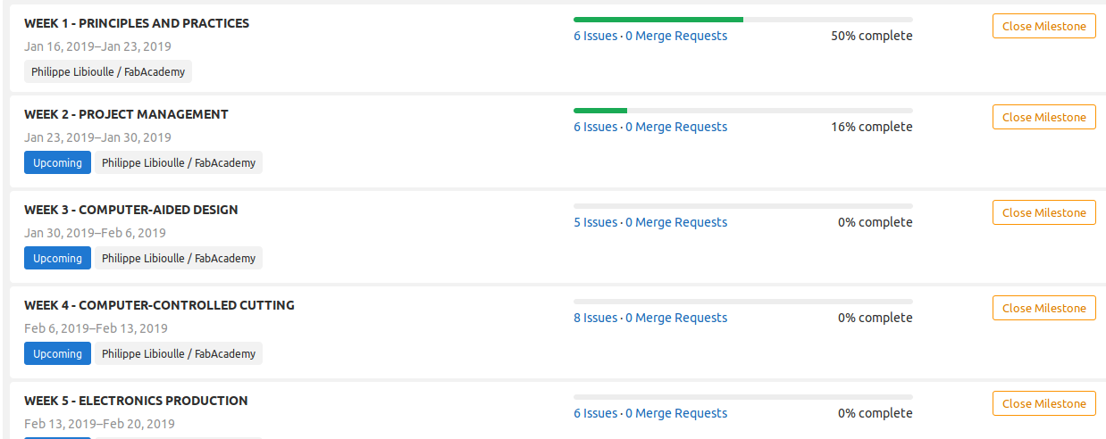 GitLab is not only about source control. There are other features, such as a Kanban/SCRUM subsystem. Here is how it works: in GitLab terms, everything is an "Issue" (similar to JIRA, another SW management system). You may consider that an "Issue" is "Something you have to do". You can define "milestones" (like you would declare "sprints" in a SCRUM system) and attach your "issues" to those "milestones" Here is how my "Fab Academy journey" looks like: