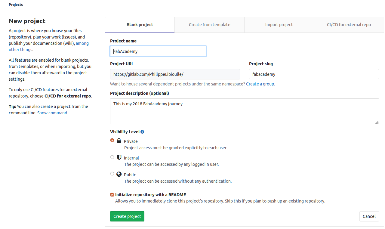 There are two options when you want to start with GitLab: the first one is to setup your own, self hosted environment (i.e "on premise") and the second one is to leverage existing cloud-based environment. Fab Cloud and my own environments are hosted on the Cloud. Then you have to create a projet (Fab Academy staff did it for you) and decide whether the project is public (anybody can see it) or private (only for people you give access to).