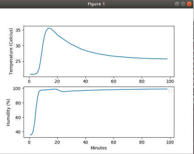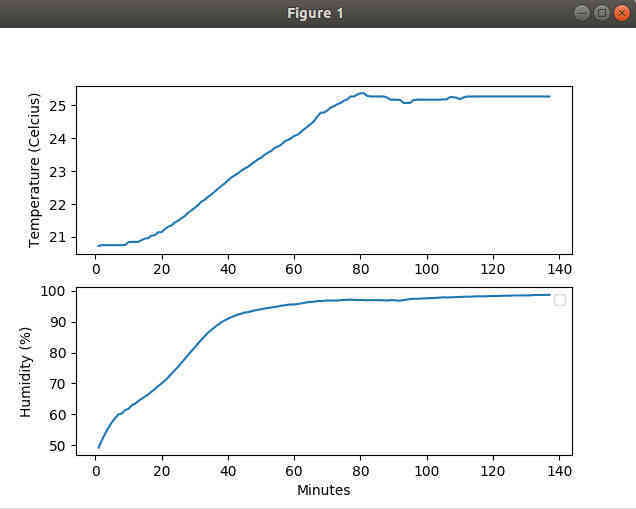 The second picture shows what happens when I start the rice cooker in "keep warm mode". It takes 80 minutes to reach the 25 C level and humidity reaches the target of 80% quickly