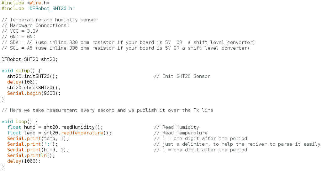 Here is a very simple sketch that gathers temperature and humidity measurements every one second and publish it over the Tx line. For this week, the OLED screen is not very usefull since I just want to gather data over a long period os time and to use it to draw a graph