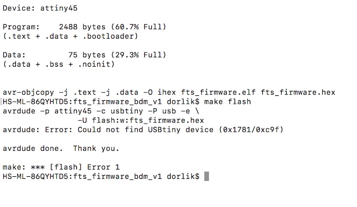 avrdude -p attiny45 -c avrisp -P usb -e \ -U flash:w:fts_firmware.hex avrdude: ser_open(): can’t open device “usb”: No such file or directory