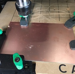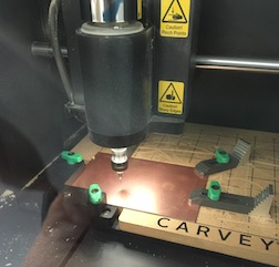 I tried to mill the PCB on my Carvey Machine but I was unsuccessful. Here is the board clamped into place in my CNC router.