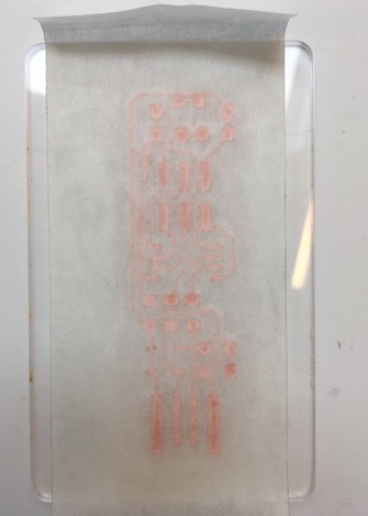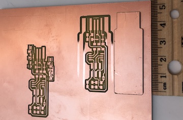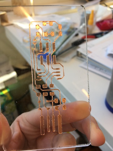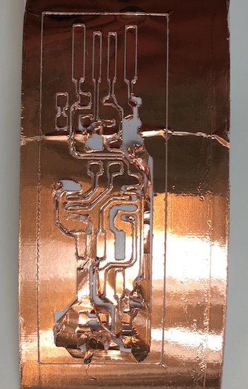 In the meantime, I also tried cutting the pcb traces on the Roland vinyl cutter. I had to experiment with different speed and force settings before I finally got one that worked (3 or 4 failed attempts), but it was too delicate to take the extra out.