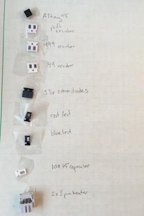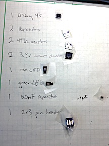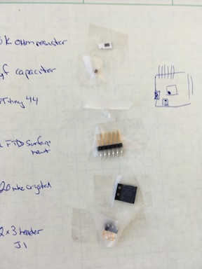 Today I had an opportunity to gather the parts for this tiny circuit board. Taping them to the paper was a good idea. They won’t get lost on my desk!