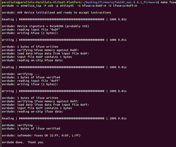 Now I need to change the bit that will turn the ATtiny45’s reset pin into a GPIO pin by typing in Terminal: rstdisbl.