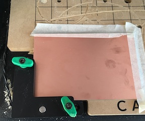 - double-sticky-taped the copper-plated board (6 x 4) to the sacrificial base