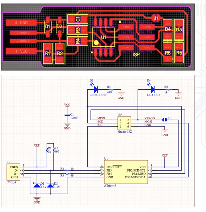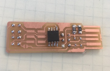 Blair suggested that I try just replacing the tiny45 chip but I lost most of the traces when I tried to remove the old one from the board. It made more sense to rebuild the programmer board from scratch because it had been my first try at soldering (my first try at this entire process, really) so a second try would produce a better board.