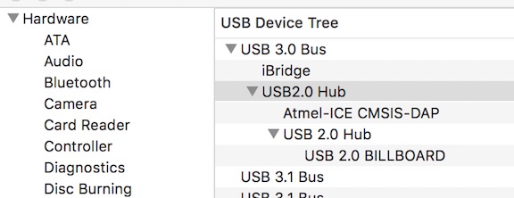 The Macbook’s System Report sees the USB hub and the Atmel but not the board.