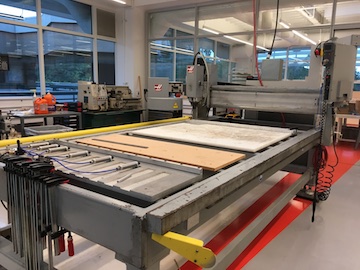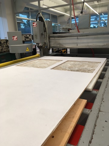 We figured out the relative size of our plywood to the size of our Haas CNC router. Then we clamped some 2 x 4s to the router as a positive stop and then calibrated that place to the machine so we knew where the zero was. (In other words, we built a frame for the plywood pieces by clamping 2 x 4s to the router bed. That allowed us to put new sheets of plywood into the same 2x4 fixture over and over and still have the same zero point.