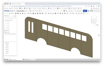 The next steps are translating that svg to Fusion 360 and then to OnShape so that we can cut out the pieces on the router. As it turned out, the bus changed from a school bus to a municipal bus (for strategic emotional reasons) so we started with a new picture when we got to Fusion 360. The new design is easier to CAD because the pieces are more symetrical.