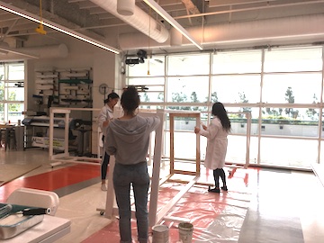 The team also learned not to wear their nice clothes on the day we’re going to primer-paint the frame. We used outdoor, heavy duty “Kilz” primer paint. The bus will be outside and plywood will not hold up to the weather without two coats of paint.