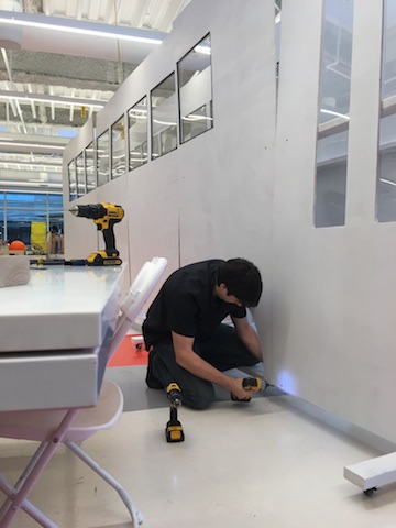 Assembly required a few people and clamps to hold the pieces on the frame straight. The team learned (the hard way) what happens when the panels are not straight and level on the frame. When they tried to put the frame pieces together, they didn’t fit. Luckily, drywall screws come out pretty easily.
