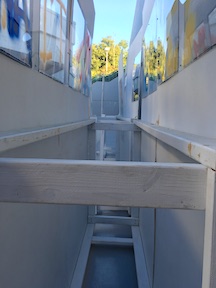 Then they outlined each window with black rubber tubing to make it look like a real bus. Glue was an issue here. The wood frame did not like the acrylic glue but the rubber and the plexi didn’t respect wood glue. The team chose acrylic after conducting some tests. So far, so good. The rubber window gasket has withstood quite a bit of rain.