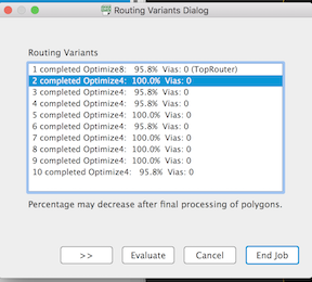 After making sure my design rules were set to 16mm clearance and 12mm minimum trace, I clicked on AutoRouter. As you can see, he had a pretty easy time coming up with 5 different 100% routes. He really saved me alot of time this time.