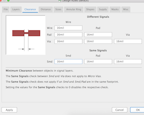 I notice that some of my traces are pretty close together so I remember to check the “Clearance” setting. Those numbers need to be 16.