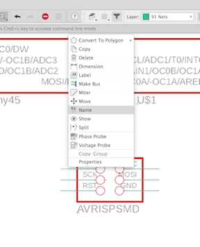 To designate a name for a connection, draw a line with the Net tool and then right click on it to bring up this menu. Then right click to choose Name.