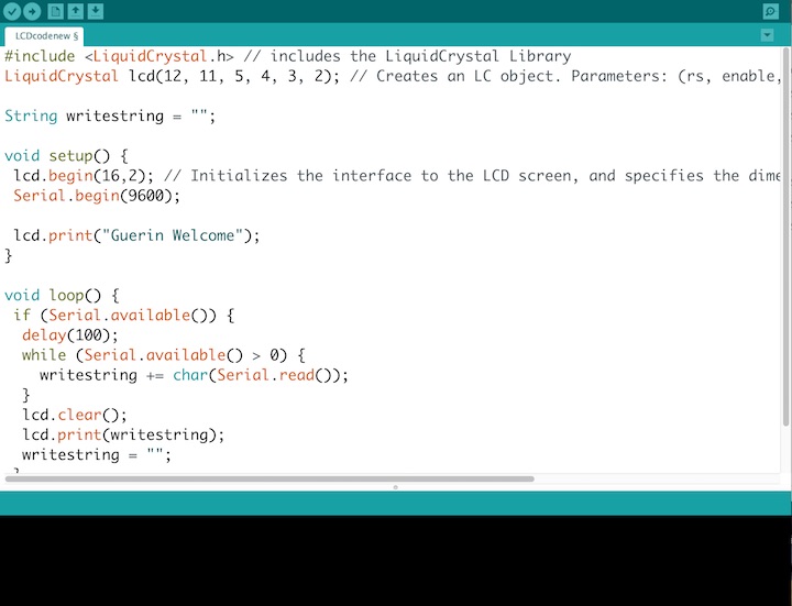 I used some of my Arduino code to initialize the LCD pin-by-pin, deal with the Arduino serial port, and communicate with Python when the User inputs text in the GUI. This code will sit in the Arduino and wait for information from the User via my laptop. It looks like this: