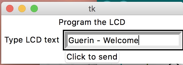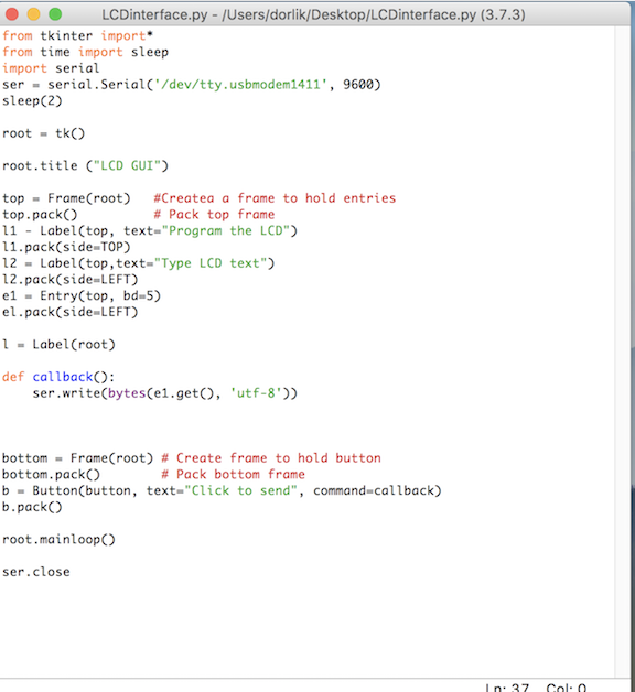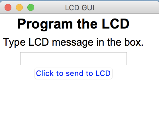 My GUI needs to be simple. I am asking for user input like “Type something to display on the LCD:” and then a button to click to export the user input into the LCD through the serial port.