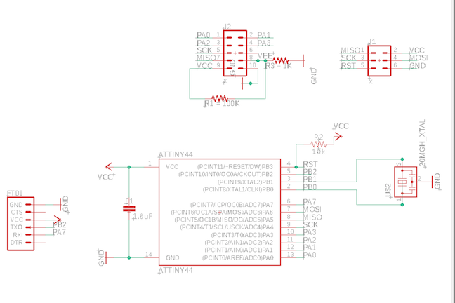 I took the 5v regulator off of the original board as I will be powering it through the FTDI. I need the TX pin to talk to the ATTiny44 to push the signal from my Python GUI for the interfaces week.