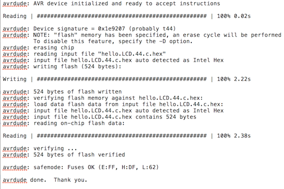 Then I booted up Parallels and flashed it with my c code. It uses Neil’s code but adds in the BasicSerial3.h and BasicSerial3.S code that I need to communicate with the Tiny44 via FTDI. I modified the c code to send the two Serial files to the microcontroller. It’s always so exciting to see this: